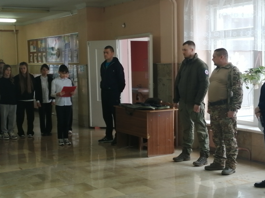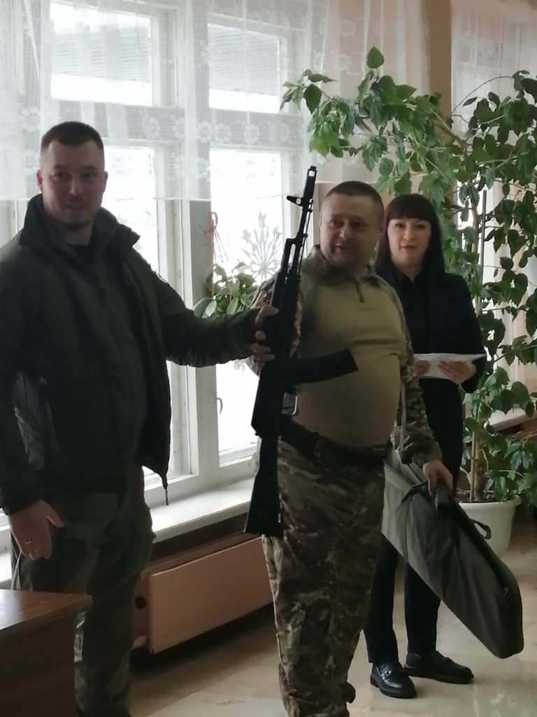 Организатор линейки учитель ОБЗР Тимофеев Василий Владимирович предоставил слово гостю, руководителю КФХ - Дозорову Александру Сергеевичу. В своей речи Александр Сергеевич подчеркнул, что 2025 год объявлен в России Годом Защитника Отечества, наша страна готовится к празднованию 80-летия Победы в Великой Отечественной войне. И в преддверии этого праздника он подарил школе макет автомата Калашникова.