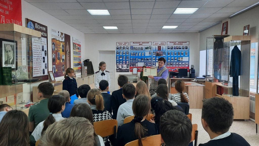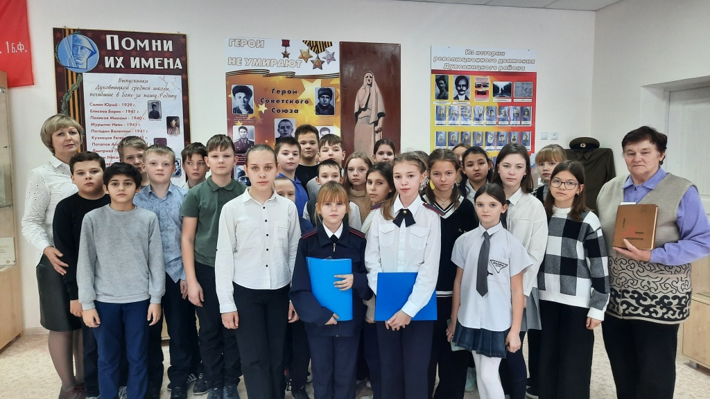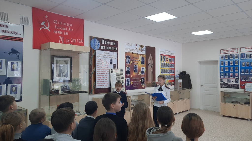 Активисты музея Агапова М., Андреева А., Вертеева А. (6 «В» кл.) для обучающихся 5 «А» класса представили литературно-патриотическую композицию о жизни и подвиге Героя, а присутствующая на мероприятии Смольянинова Надежда Ивановна, методист центральной районной библиотеки, сделала обзор художественной и документальной литературы, рассказывающей о Николае Васильевиче Грибанове – 19-летнем пареньке из волжского села, настоящем патриоте своей Родины, пожертвовавшим своей жизнью во имя освобождения ее от немецких оккупантов.