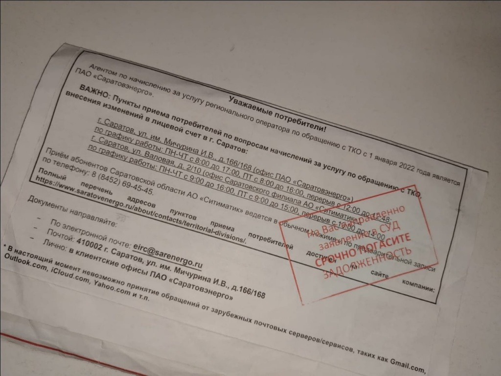 Жители Саратовской области, получившие досудебные уведомления и желающие задать уточняющие вопросы, могут обратиться в контакт-центр регионального оператора по обращению с ТКО по тел. 8 (8452) 25-64-90.