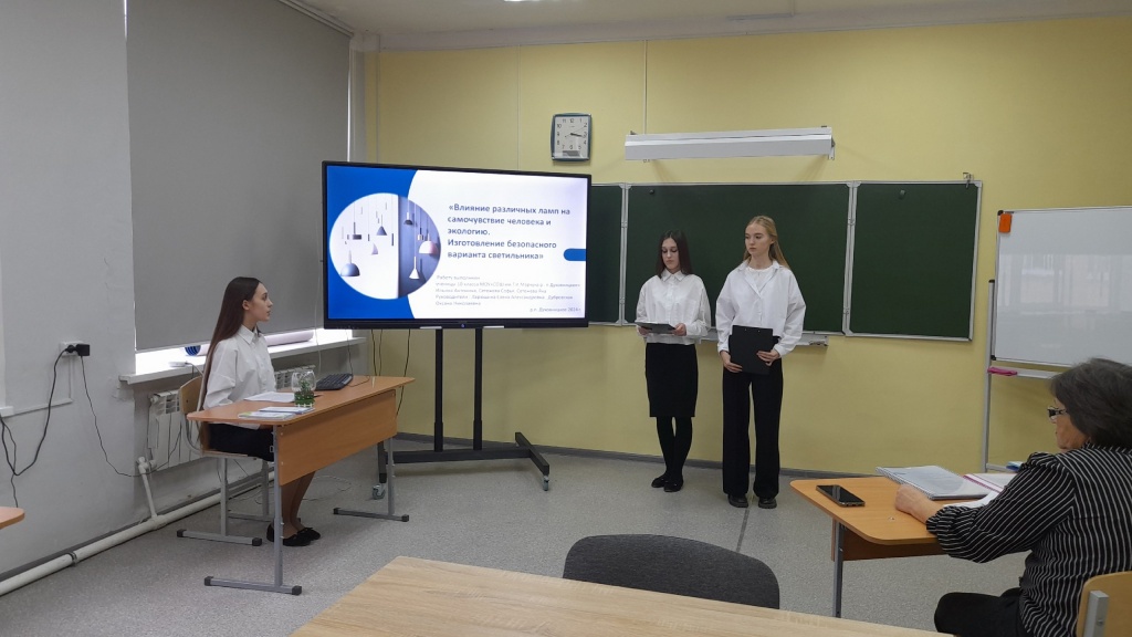 1 место заняли Сетежева С., Сетежева Я. и Ильина А. с работой "Влияние различных ламп на самочувствие человека",
