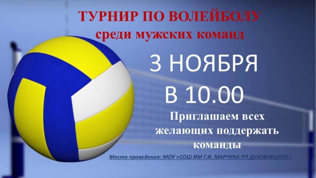 03 ноября в 10:00 в спортивном зале МОУ "СОШ им.Г.И. Марчука" состоится турнир по волейболу среди мужских команд, посвящённый Дню народного единства.