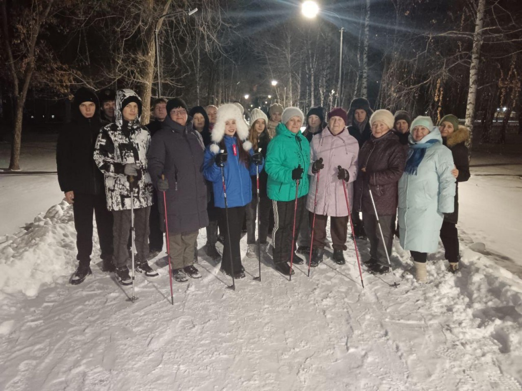 Прекрасным зимним вечером участники, вооружившись палками, отправились по живописным тропам, наслаждаясь свежим воздухом и красотой природы.