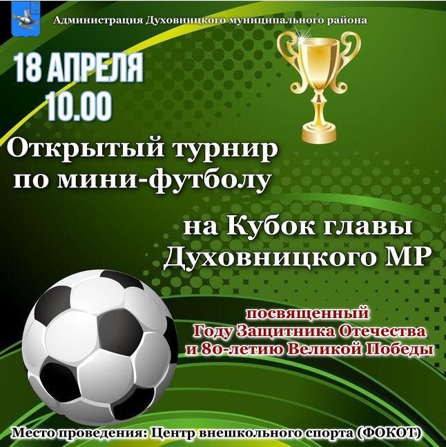18 апреля в 10.00 часов на физкультурно-оздоровительном комплексе открытого типа р.п.Духовницкое состоится открытый турнир по мини-футболу среди команд юных футболистов (2013-2014 г.р.) на Кубок главы Духовницкого муниципального района, посвященный Году Защитника Отечества и 80-летия Победы в Великой Отечественной войне 1941-1945 гг.