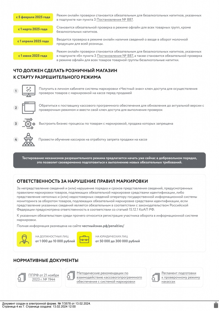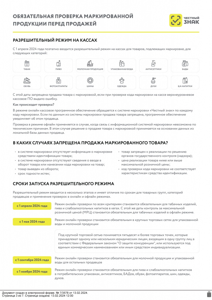 В соответствии с постановлением Правительства Российской Федерации от 21 ноября 2023 года № 1944 «Об утверждении перечня случаев, при которых продажа товаров, подлежащих обязательной маркировке средствами идентификации, запрещена на основании информации, содержащейся в государственной информационной системе мониторинга за оборотом товаров, подлежащих обязательной маркировке средствами идентификации, или отсутствия в указанной государственной информационной системе необходимой информации о таких товарах, и особенностей внедрения указанного запрета в отношении отдельных товаров, а также Правил применения запрета продажи товаров, подлежащих обязательной маркировке средствами идентификации, на основании информации, содержащейся в государственной информационной системе мониторинга за оборотом товаров, подлежащих обязательной маркировке средствами идентификации, или отсутствия в указанной государственной информационной системе необходимой информации, в том числе правил получения информации из указанной государственной информационной системы» (далее – Перечень, Правила, информационная система маркировки) с 1 апреля 2024 года поэтапно вводится запрет продажи товаров, подлежащих обязательной маркировке средствами идентификации, на основании информации, содержащейся в информационной системе маркировки, в случаях, указанных в Перечне, а также вступают в силу требования к участникам оборота товаров, подлежащих обязательной маркировке средствами идентификации, при определении случаев запрета продажи указанных товаров, предусмотренные Перечнем и Правилами соответственно.