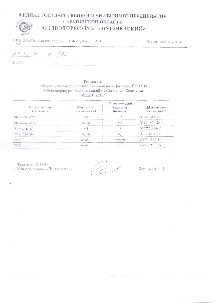 Результаты лабораторных исследований питьевой воды с. Озерки от 20.03.2017