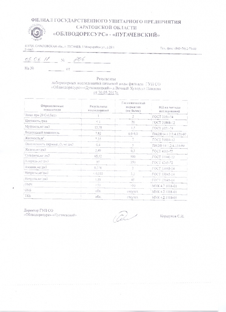 Результаты лабораторных исследований питьевой воды д. В. Хутор от 30.05.2017