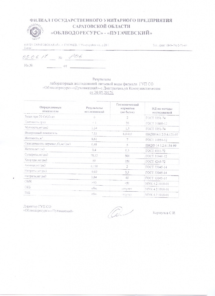 Результаты лабораторных исследований питьевой воды с. Дмитриевка от 30.05.2017