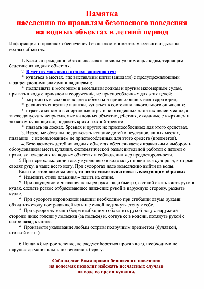 Памятка населению по правилам безопасного поведения на водных объектах в летний период