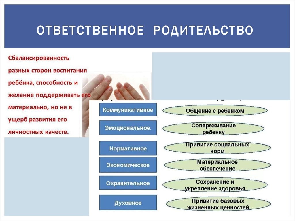 По мнению специалистов, ответственный родитель, в первую очередь, – зрелый человек, способный отвечать за свои поступки и за свою жизнь, ведь, если этого нет в отношении самого себя, как можно говорить об ответственности за маленького человека? Итак, ответственное родительство - это, прежде всего, сбалансированность разных сторон воспитания: