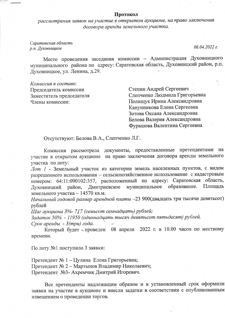 Протокол рассмотрения заявок на участие в открытом аукционе, на право заключения договора аренды земельного участка
