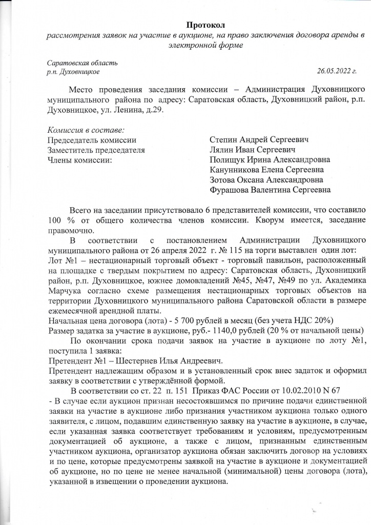 Протокол рассмотрения заявок на участие в аукционе, на право заключения договора аренды в электронной форме