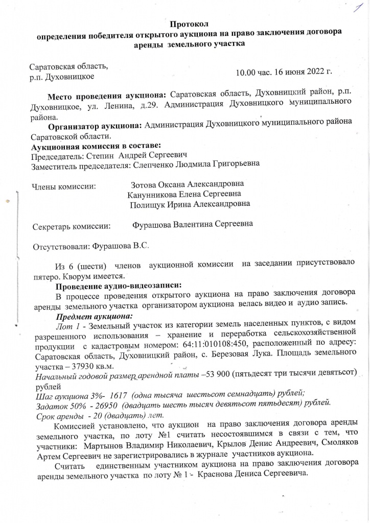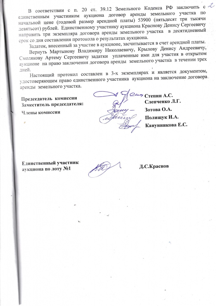 Протокол определения победителя открытого аукциона на право заключения договора аренды земельного участка