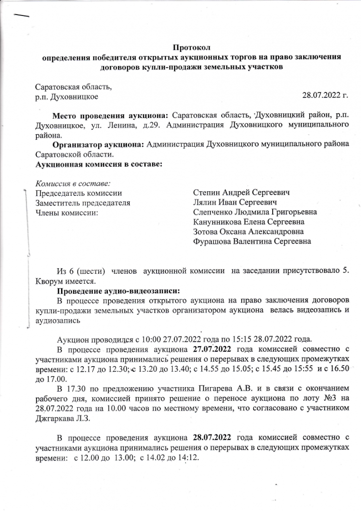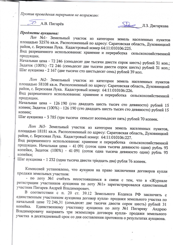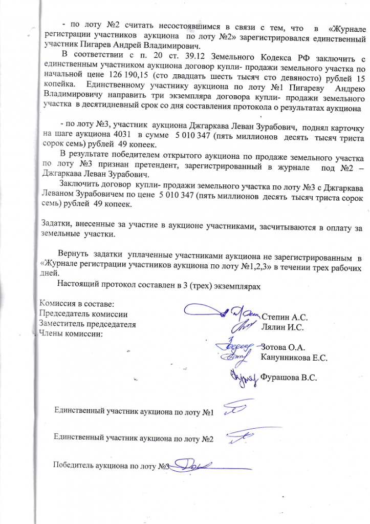 Протокол определения победителя открытых аукционных торгов на право заключения договоров купли-продажи земельных участков