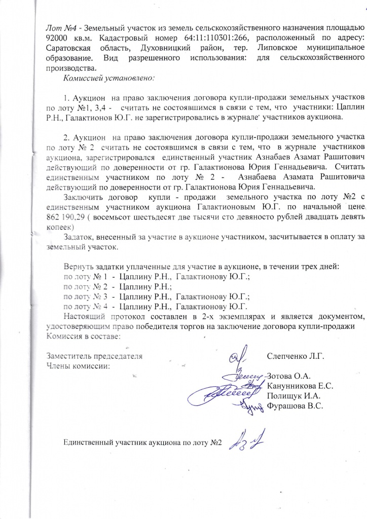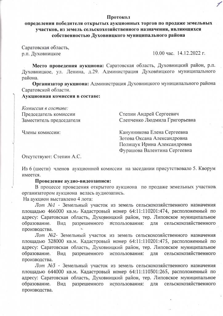 Протокол определения победителя открытых аукционных торгов по продаже земельных участков, из земель с/х назначения, являющихся собственностью Духовницкого МР