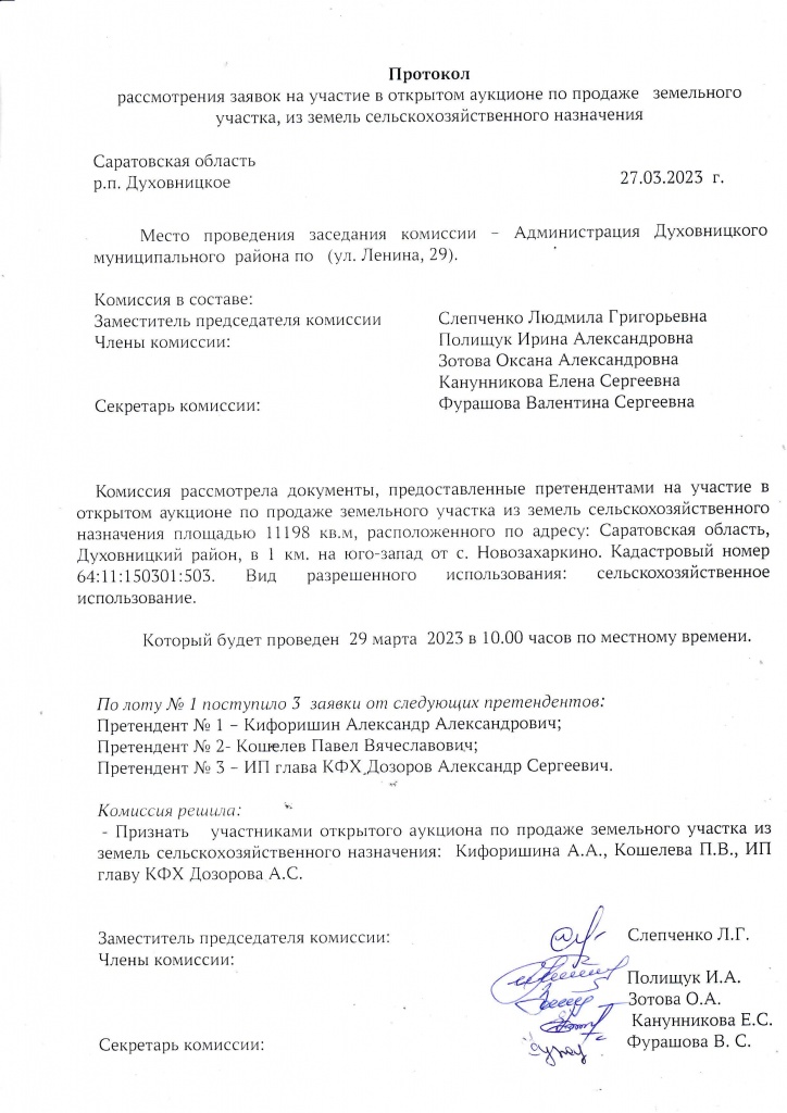 Протокол рассмотрения заявок на участие в открытом аукционе по продаже земельного участка, из земель сельскохозяйственного назначения