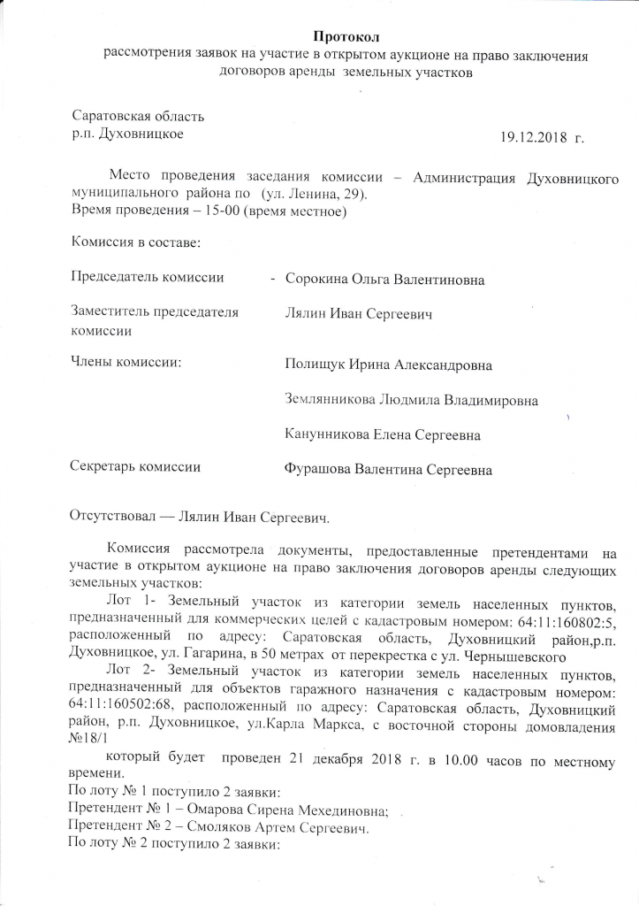 Протокол рассмотрения заявок на участие в открытом аукционе на право заключения договоров аренды земельных участков от 19.12.2018