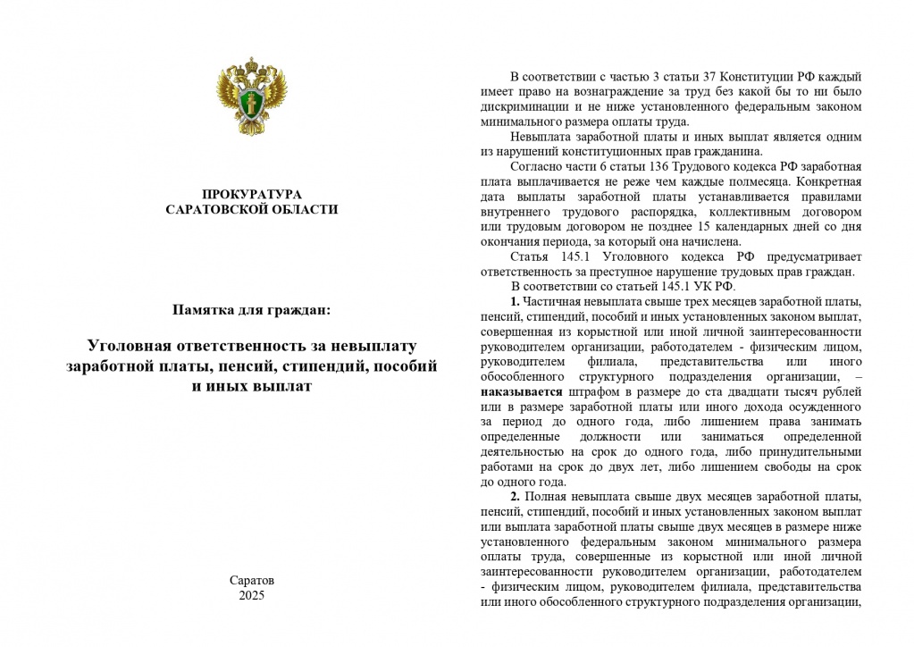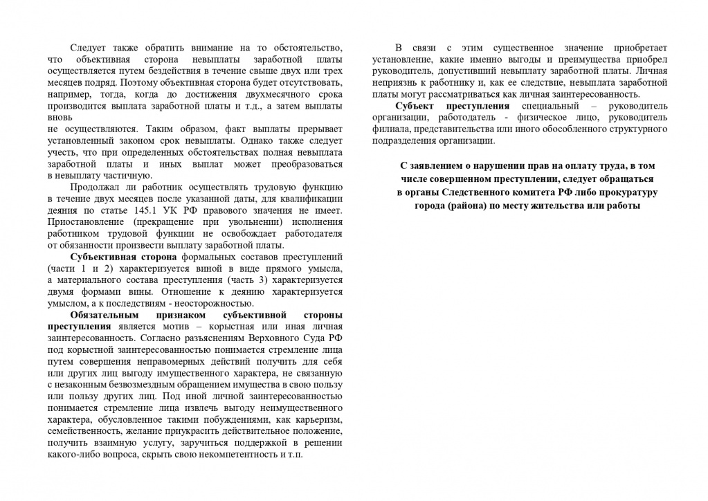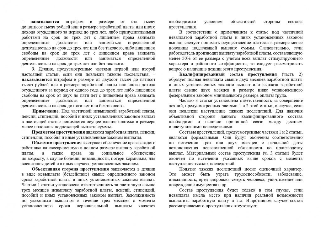 Памятка с разъяснением законодательства об уголовной ответственности за невыплату заработной платы, пенсий, стипендий, пособий и иных выплат.