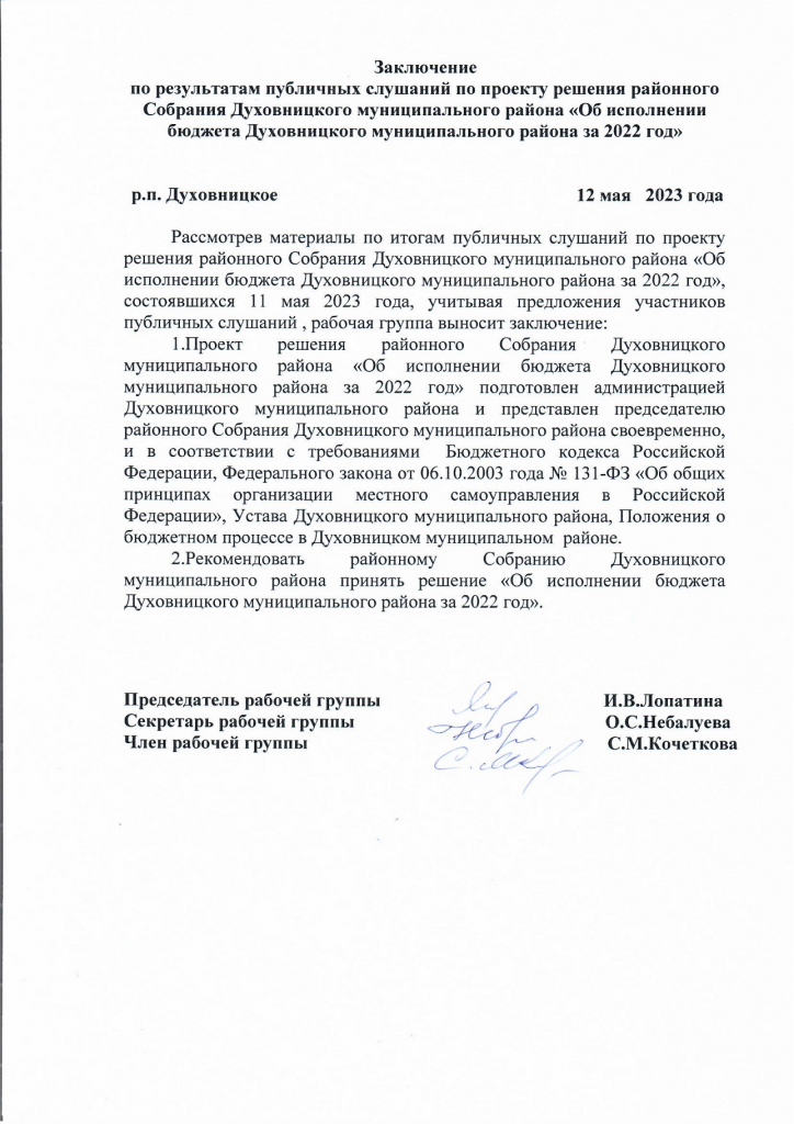 Заключение по результатам публичных слушаний по проекту решения районного Собрания Духовницкого муниципального района «Об исполнении бюджета Духовницкого муниципального района за 2022 год»