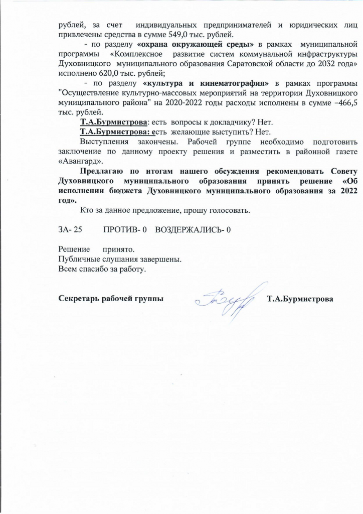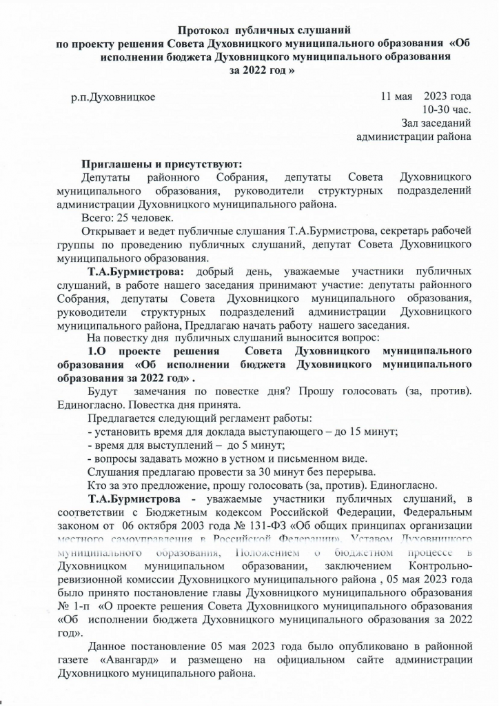 Протокол публичных слушаний по проекту решения Совета Духовницкого муниципального образования «Об исполнении бюджета Духовницкого муниципального образования за 2022 год »