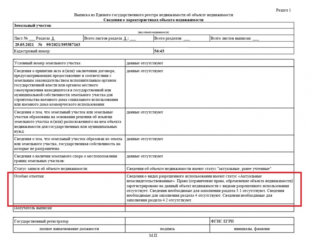 Рассмотрим еще один пример, когда в строке «особые отметки» указано: «отсутствуют сведения для заполнения п.4,4.1 и 4.2».