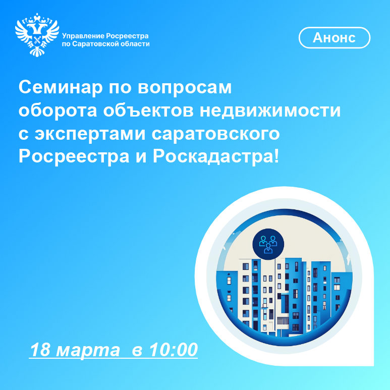 18 марта в 10.00 саратовские Росреестр и Роскадастр проведут консультационный семинар по вопросам оборота объектов недвижимости.