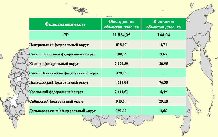 ФГБУ «Россельхозцентр», согласно Протоколу селекторного совещания №АР-19/24 от 14 января 2022 г. под председательством заместителя Министра сельского хозяйства Российской Федерации А.В. Разина, проводит обследования по выявлению неиспользуемых земель, зарастающих сорной, древесной и кустарниковой растительностью ежемесячно. В целом данная работа ведется сотрудниками ФГБУ «Россельхозцентр» с 2021 года. В 2022 году специалистами филиалов ФГБУ «Россельхозцентр» было обследовано 11 834,05 тыс. га земель сельскохозяйственного назначения, выявлено 144,04 тыс. га неиспользуемых земель и направлено 214 писем в территориальные управления Россельхознадзора. Больше всего обследовано площадей и выявлено в 2022 году было в Приволжском федеральном округе - 76,38 тыс. га неиспользуемых земель, Сибирском федеральном округе – 29,18 тыс. га, в Южном федеральном округе – 20,9 тыс. га, Уральском федеральном округе – 6,49 тыс. га, в Центральном федеральном округе – 4,74 тыс. га, в Северо-Западном федеральном округе – 3,65 тыс. га, в Дальневосточном федеральном округе – 2,65 тыс. га.