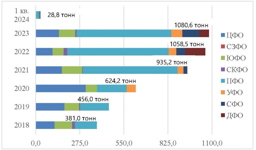 В 1 квартале 2024 года хозяйства подали 305 заявок в филиалы о необходимости утилизации тары от СЗР, на утилизацию в регионах России было отгружено 28,8 тонн использованных канистр от СЗР (в 2023 г. – 1080,6 тонн, в 2022 г. – 1058,5 тонн, в 2021 г. – 935,2 тонны, в 2020 г. – 624,2 тонны, в 2019 году – 456,0 тонн и в 2018 году – 381,0 тонна). Всего в период с 2018 по 2024 годы было отгружено 4564,2 тонн канистр (биг-бегов, плёнки и тп.) от СЗР (табл. 1).