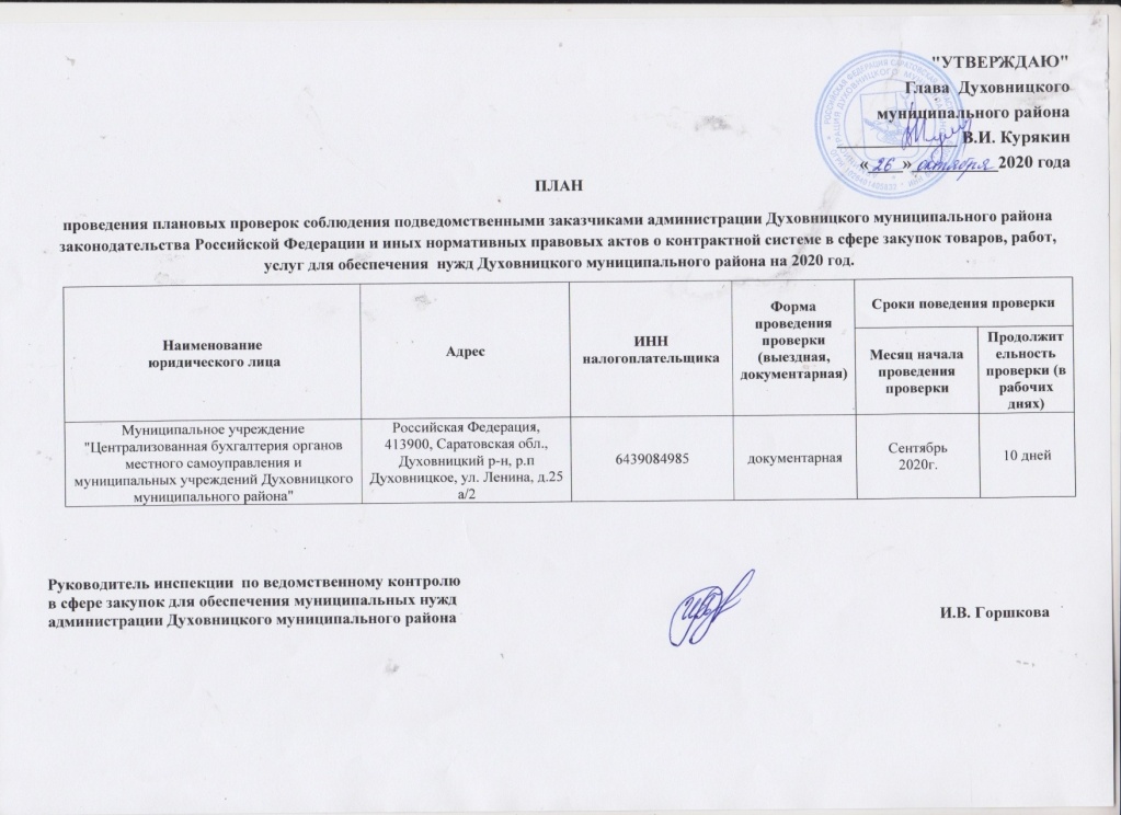 План проведения плановых проверок соблюдения подведомственными заказчиками законодательства Российской Федерации и иных НПА о контрактной системе в сфере закупок товаров, работ, услуг для обеспечения нужд Духовницкого муниципального района на 2020 год